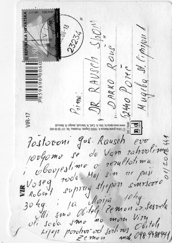 voilà nous donnons notres nouvelles et nous voulons vous remercir et vous informer des resultats de votre travail. Mon fils Robert ne fume pas. Mon mari Stjepan a maigri 30 kg. Moi, Marija j’ai maigri 10 kg. Nous sommes la famille Zemon de Sesvete, mais nous sommes chez moi à Vir. Bien des saluts de la famille Zemon.