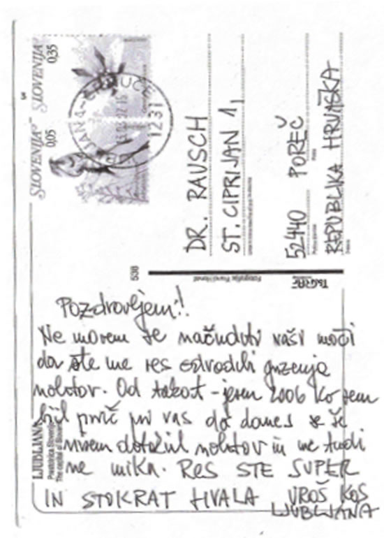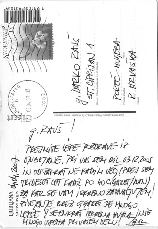 Reçoivez bien les saluts de Ljubljana. J’ai suis été chez vous le 3 décembre 2005 et de ce jour  je ne fume pas. (J’ai fumé pour 30 ans quarante cigarettes chaque jour). Je vous exprime mes remerciements sincères! La vie sans cigarettes est beaucoup plus belle! Encore une fois merci bien et je vous souhaite beacoup de succès pendant votre travail