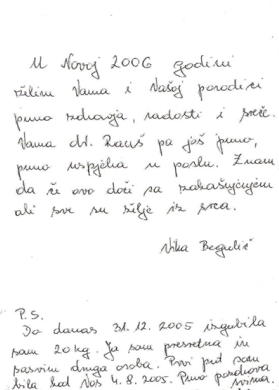 Jusqu’à 30 décembre 2005, j’ai perdu 20 kg. Je suis très heureuse et j’ai la sensation d’être une autre personne. J’étais chez vous la première fois le 4 août 2005. Bien de saluts a tous. Vika Begulič
