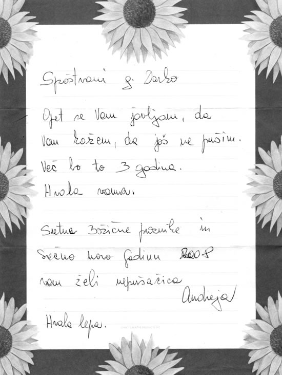 Je vous envoie mes nouvelles de nouveau pour vous dire qui je ne fume encore. Il y a trois ans: grace à vous. Je vous souhaite de heureuxes fêtes de Noël et une bonne nouvelle année 2008. Ce sont les souhaits de l’ex fumeuse Andreja. Merci bien.